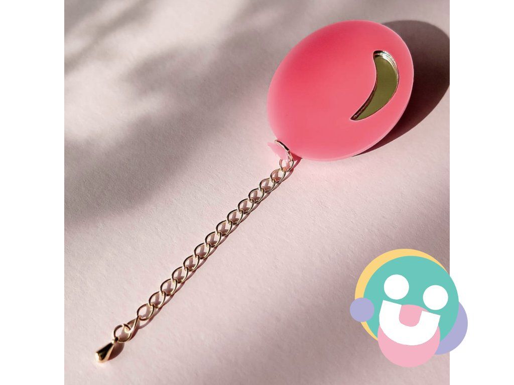 Veselá brošňa v tvare balóna so zlatou bižutérnou retiazkou. Lasom vyrezávané akrylátové sklo v matnej a zrkadlovo zlatej farbe. Na výber dva varianty (bodky, alebo odlesk), každý v troch farbách.
