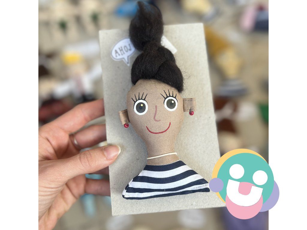 Je vyrobená zo 100% bavlny, vlásky má z ovčej plste, očká namaľované veľmi starostlivo farbami na textil, fixované teplom.