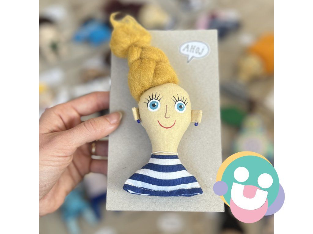 Je vyrobená zo 100% bavlny, vlásky má z ovčej plste, očká namaľované veľmi starostlivo farbami na textil, fixované teplom.