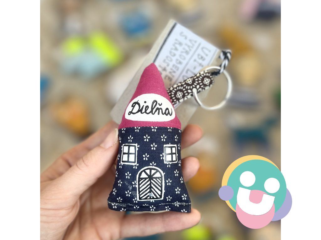 Kľúčenka domček je vyrobená zo 100% bavlny, je plnená dutým vláknom. Okienka a ďalšie maľované časti sú starostlivo namaľované farbami na textil, fixované teplom.