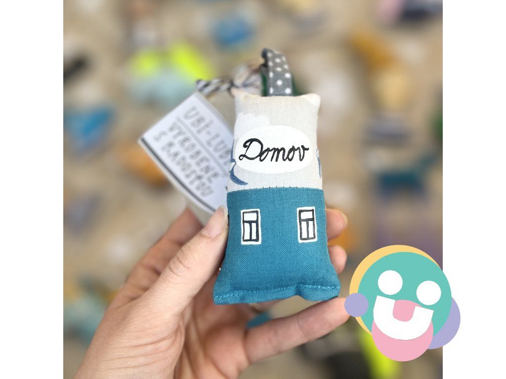 Kľúčenka domček je vyrobená zo 100% bavlny, je plnená dutým vláknom. Okienka a ďalšie maľované časti sú starostlivo namaľované farbami na textil, fixované teplom.