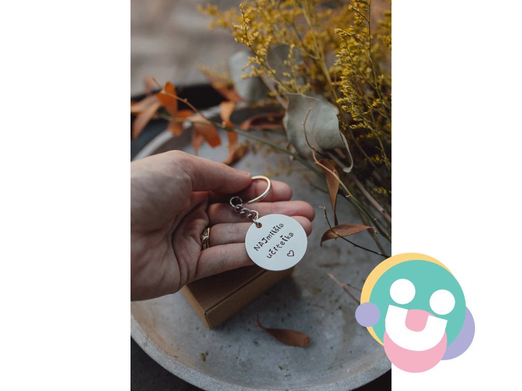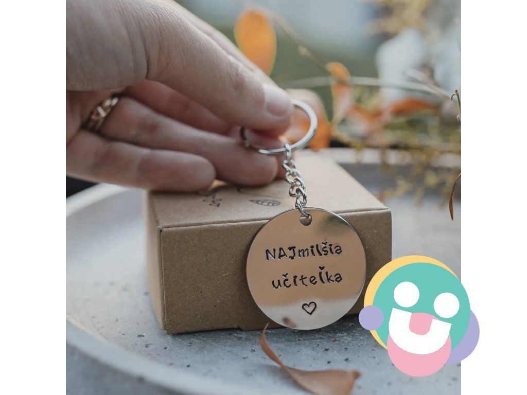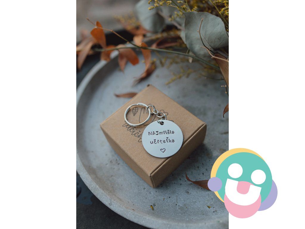 Prívesok na kľúče vyrobený z nerezovej ocele striebornej farby s ručne vyrazeným textom:"NAJmilšia učiteľka".