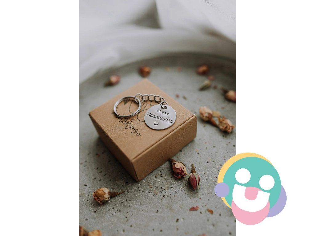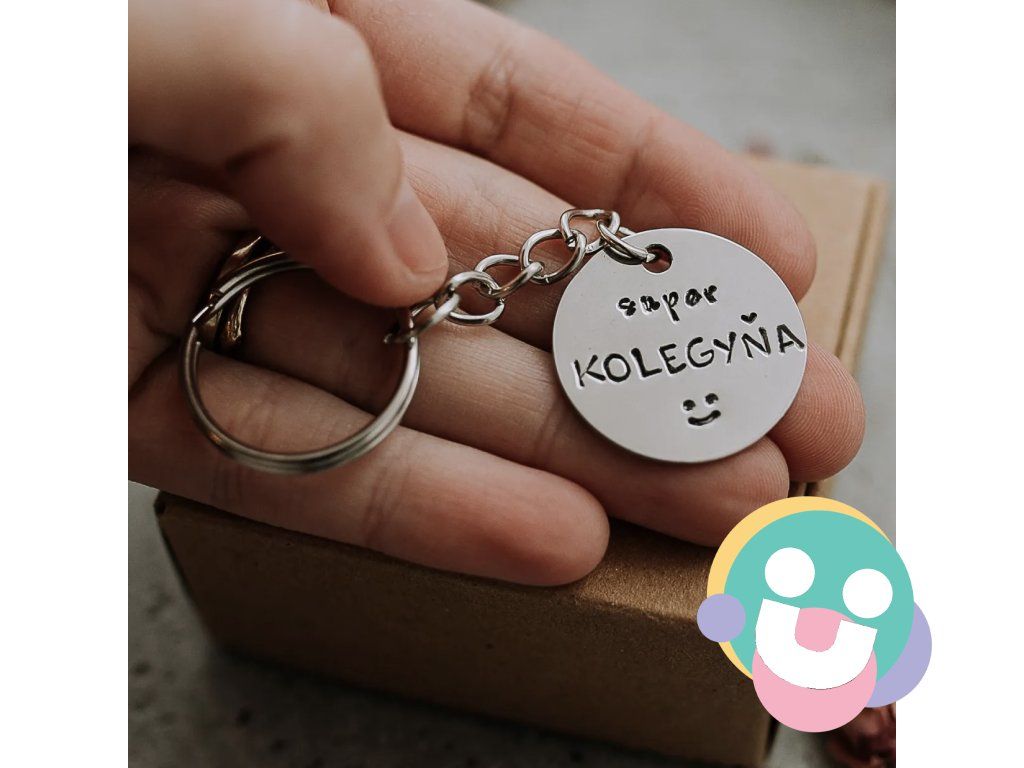 Prívesok na kľúče vyrobený z nerezovej ocele striebornej farby s ručne vyrazeným textom:"super KOLEGYŇA" a smajlíkom pod textom.