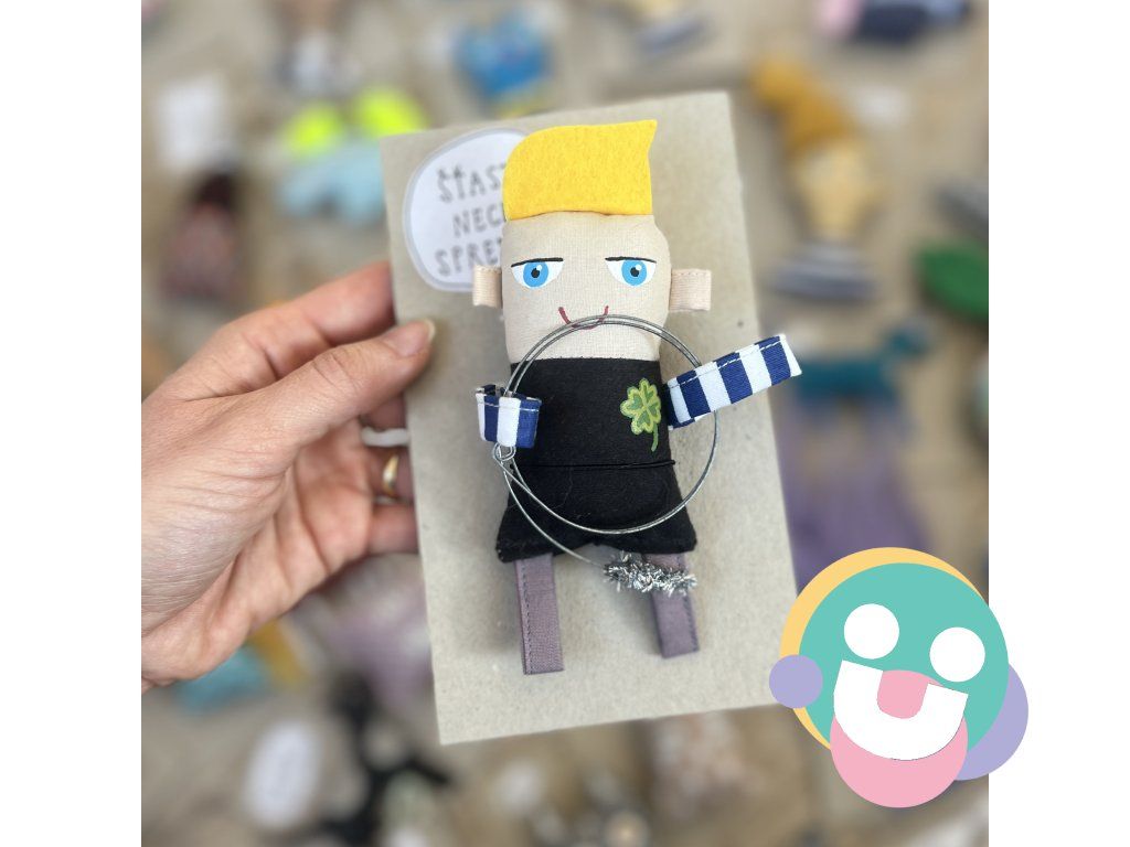 Materiál: 100 % bavlna, filc, magnet, drôt, duté vlákno, farba na textil