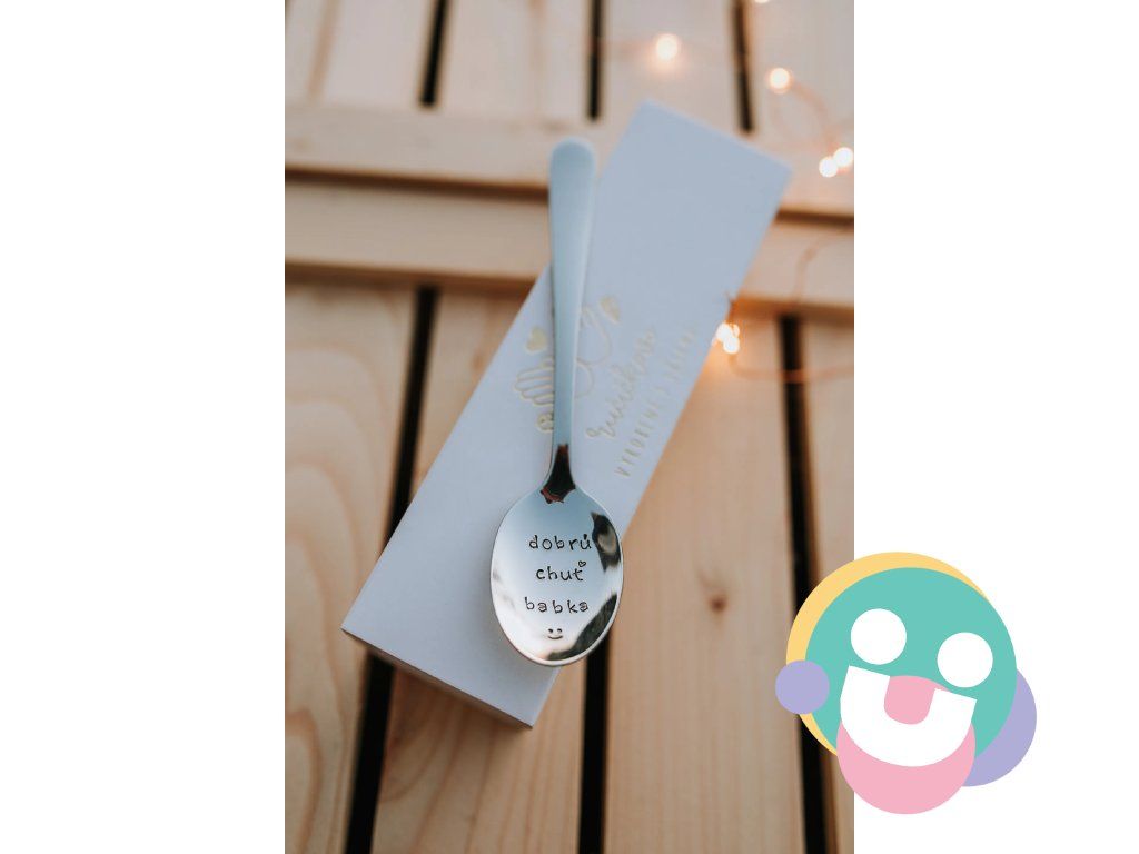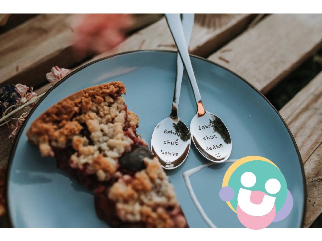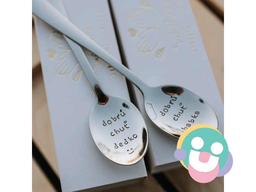 Lyžičky vyrobené z mateirálu oceľ čajovej veľkosti s dĺžkou 14 cm. na prvej lyžičke je ručne vyrazený text „dobrú chuť dedko“. Na druhej lyžičke je ručne vyrazený text „dobrú chuť babka“. Po oboma textami je ručne vyrazený symbol úsmevu.