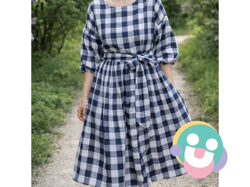 Kockované/kárované mušelínové šaty tmavomodrej farby, dĺžka pod kolená.