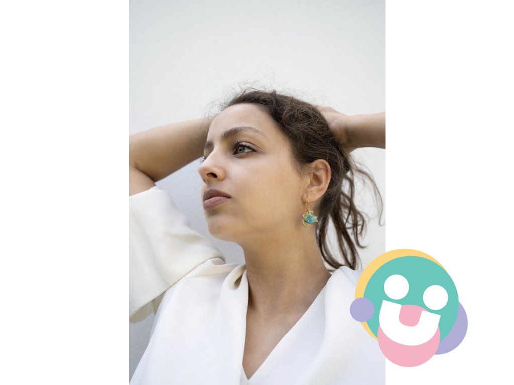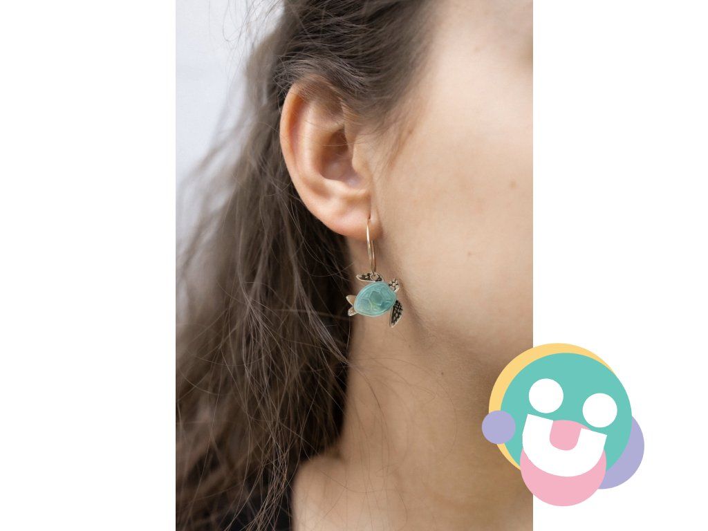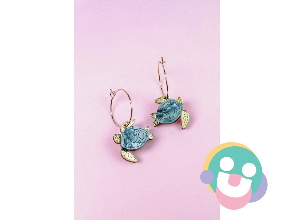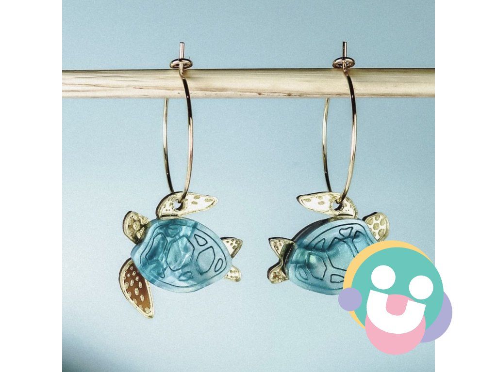 Dodajte svojmu štýlu šarm s ručne vyrobenými malými náušnicami s jedinečnými tyrkysovými a zlatými akrylovými korytnačkami na elegantných zlatých krúžkoch.