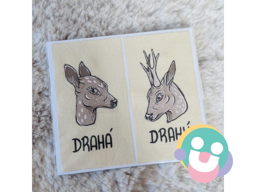 Ručne maľované nažehľovačky s motívom Srny a jeleňa s nápismi "Drahá" a "Drahý". Môžete si nimi prepojiť oblečenie bez toho, aby ste museli vlastniť rovnaké, ladiace kúsky.