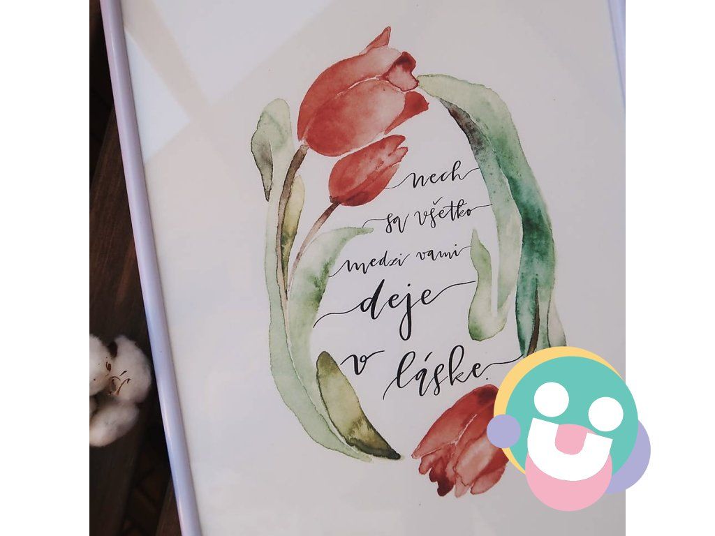 Ručne maľovaná akvarelová ilustrácia doplnená vlastnoručným kaligrafickým nápisom v digitálnej forme vytlačená na akvarelový papier.
