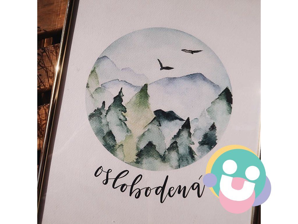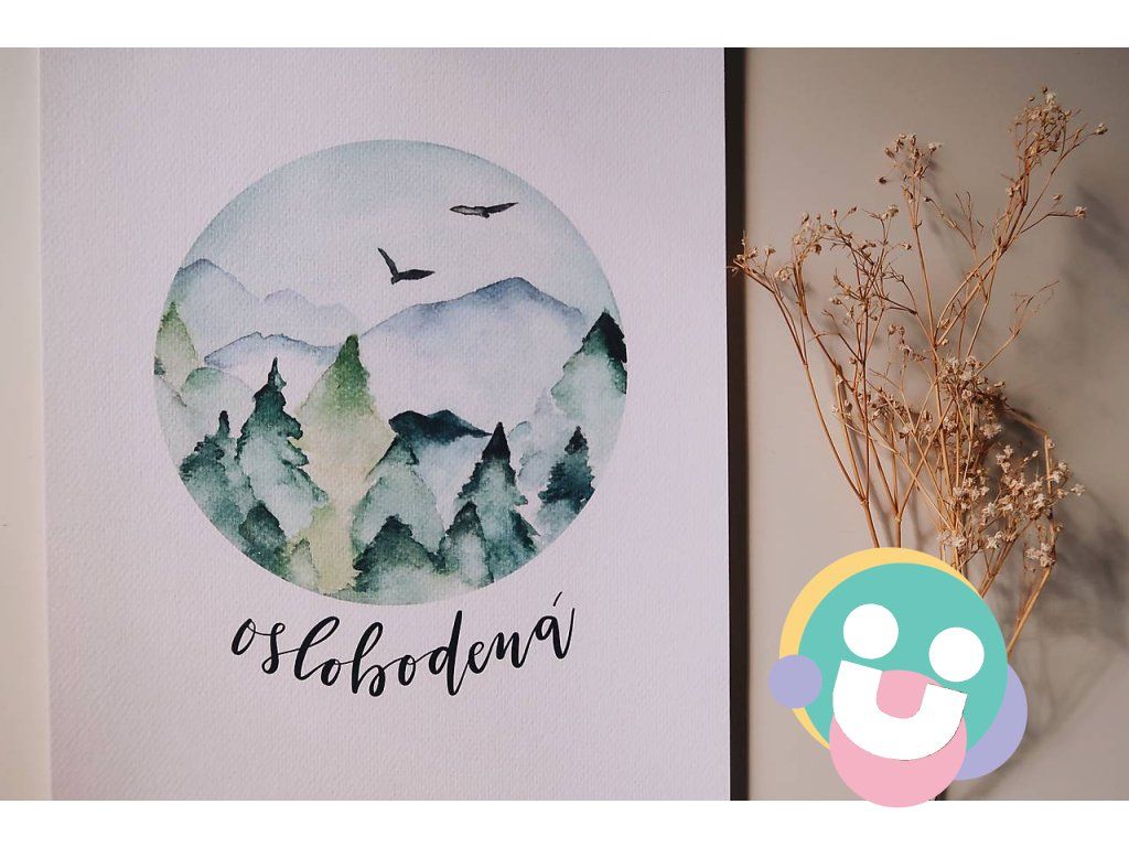 Ručne maľovaná akvarelová ilustrácia vytlačená na akvarelový papier, ktorá je doplnená kaligrafickým nápisom.