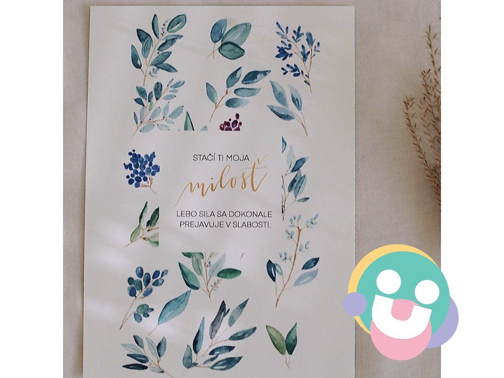 Ručne maľovaná akvarelová ilustrácia doplnená vlastnoručným kaligrafickým nápisom v digitálnej forme vytlačená na akvarelový papier.