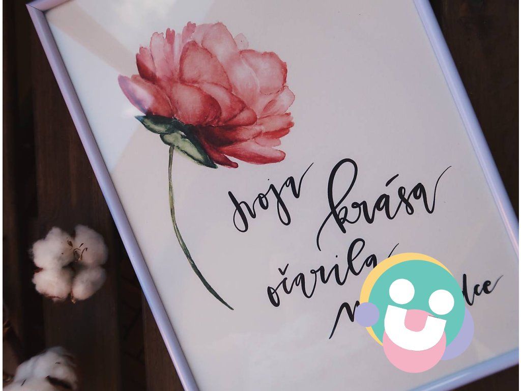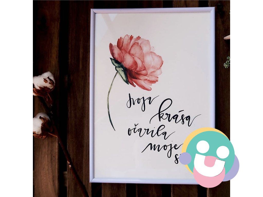 Ručne maľovaná akvarelová ilustrácia doplnená vlastnoručným kaligrafickým nápisom v digitálnej forme vytlačená na akvarelový papier.