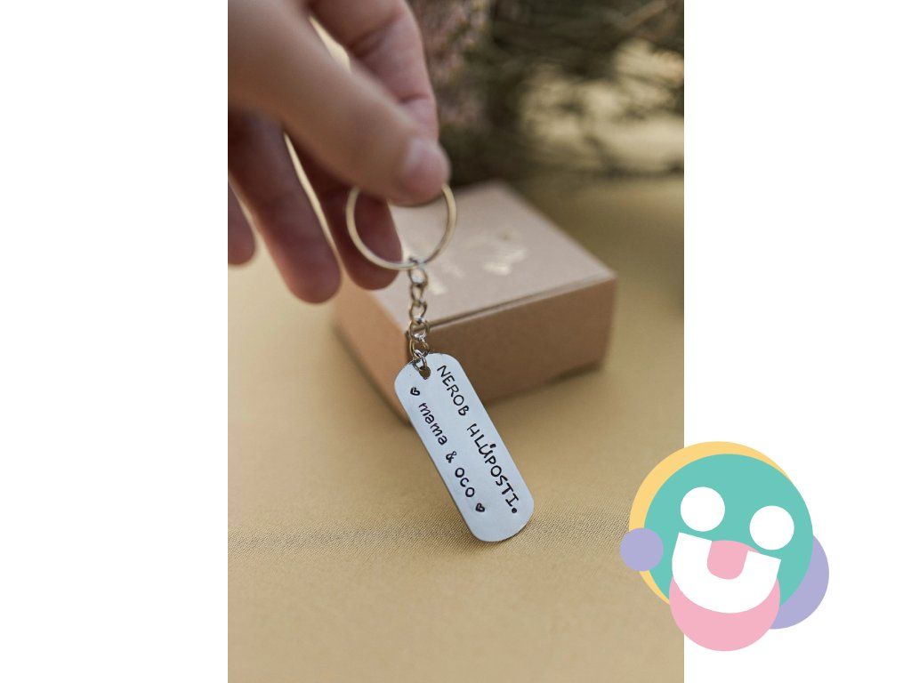 Prívesok na kľúče vyrobený z nerezovej ocele striebornej farby s ručne vyrazeným textom "Nerob hlúposti, mama a oco" doplnený o symboly srdiečka.