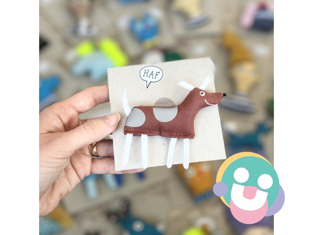 reflexná brošnička, je brošňa vyrobená zo 100% bavlny, plnená dutým vláknom. Oči má starostlivo namaľovaný farbami na textil, fixované teplom. Na telíčku má nažehlené fľaky z reflexnej fólie. Brošnička má doplnky z filcu