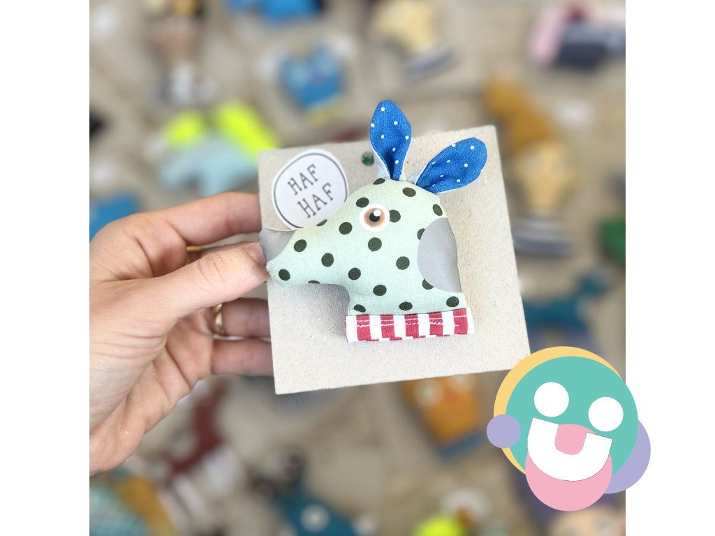 reflexná brošnička, je brošňa vyrobená zo 100% bavlny, plnená dutým vláknom. Oči má starostlivo namaľovaný farbami na textil, fixované teplom. Na telíčku má nažehlené fľaky z reflexnej fólie. Brošnička má doplnky z filcu