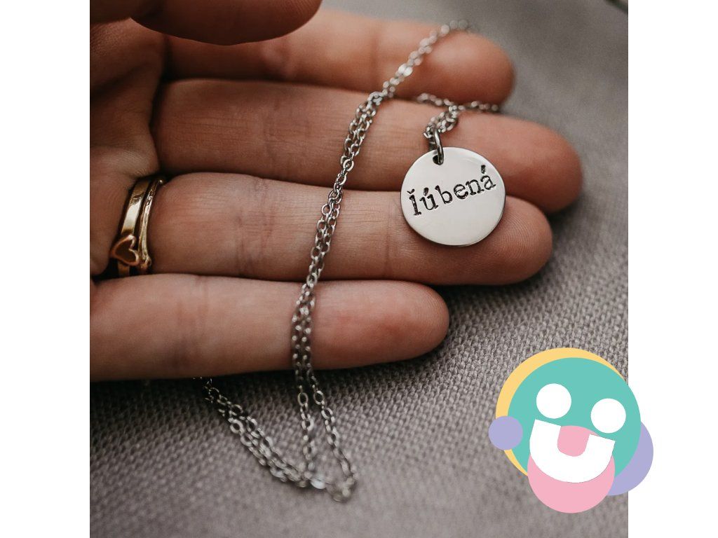 Prívesok na retiazku vyrobený z nerezovej ocele striebornej farby s ručne vyrazeným textom "ľúbená".