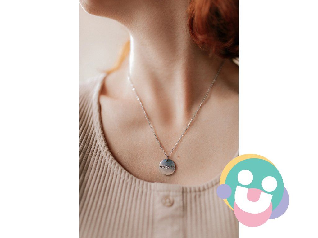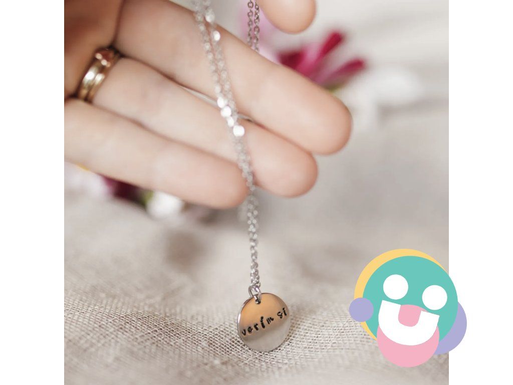 Prívesok na retiazku vyrobený z nerezovej ocele striebornej farby s ručne vyrazeným textom „verím si“ a symbolom srdca z druhej strany.