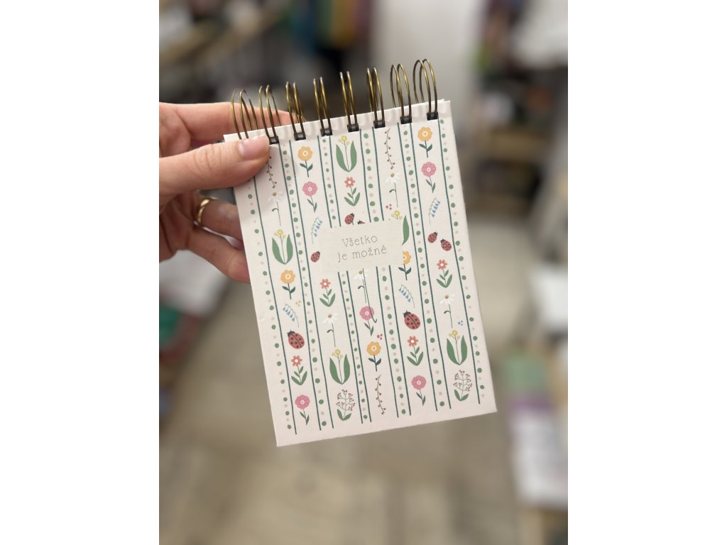 Praktický zápisník vo formáte A6 s kvetinovým vzorom a nápisom „Všetko je možné“ sa zmestí do každej kabelky či batohu, takže ho môžete mať stále pri sebe. Obsahuje 120 strán z kvalitného 100 g/m² papiera a na úvodnej transparentnej strane nájdete citát „preto ver v zázraky“. Dostupný je v čistom aj linajkovanom variante.